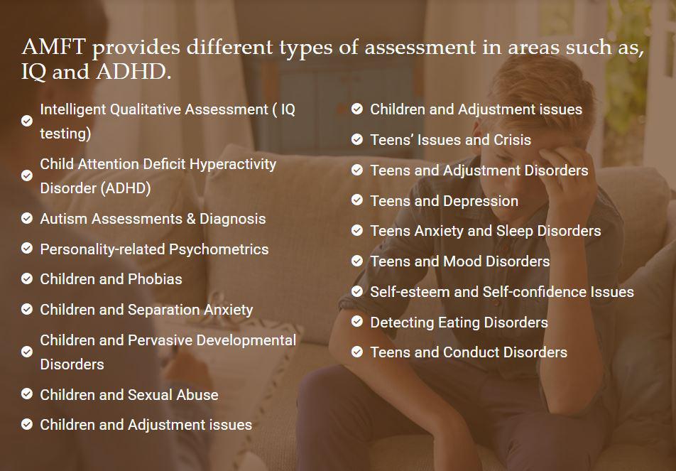 - At AMFT, we place a great emphasis on children’s and adolescents’, emotional, behavioural, academic and mental health well-being. Child and adolescent counseling and therapy offer psychological and emotional support, to help them understand and resolve conflicts they normally face, either with friends or family members. Counseling can help them recognize and change problematic behaviours, this in return will better their self-esteem and psychological well-being.